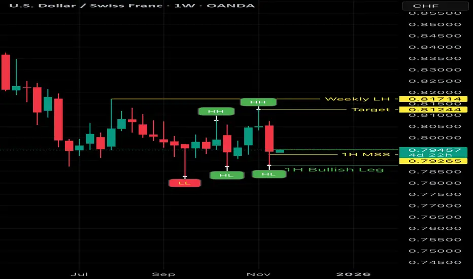 USD/CHF has been trading inside a weekly range, and price has just reacted sharply from the Weekly Low at 0.78290 — an area where buyers often step in.