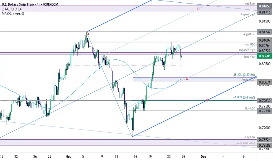 USD/CHF is trading within the confines of a proposed ascending pitchfork extending off the October / November lows. The weekly opening-range is taking shape and we are looking for a breakout to offer guidance here over the next few days.