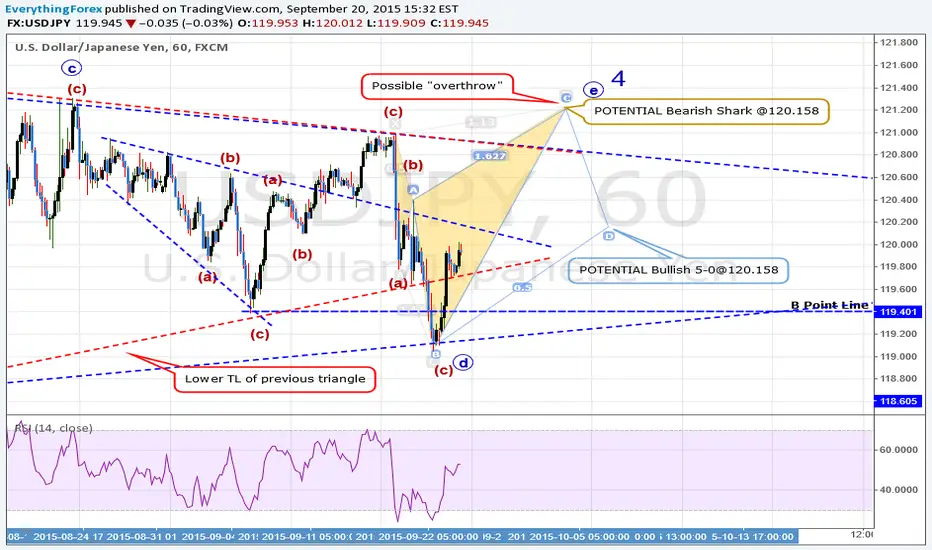 Within this final wave E of the triangle, there is a POTENTIAL Bearish shark pattern developing which also has its 1.13 completion just slightly beyond the upper TL which indicates a possible E wave overthrow of prices. However, as with all valid shark patterns, the shark is followed by 5-0 pattern. In this case, a POTENTIAL bullish 5-0 pattern which could send prices back up. Something to be aware of.