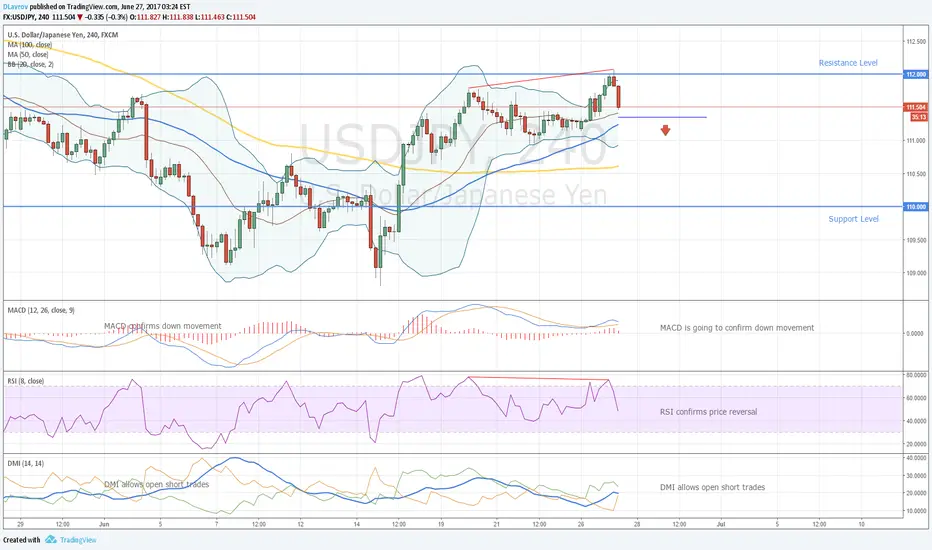 Price and RSI formed a bearish divergence at the strong resistance level. It's a reversal signal and we have short opportunity. Entry level for short trades should be below MA20 if the market breaks this line. Stop orders must be placed above 112.00 level and take-profit orders near 110.500 and 110.00 support levels. MACD histogram is going to confirm down movement. RSI confirms price reversal from the resistance level. DMI allows open short trades and if ADX line falls below 20, we'll have additional confirmation for down movement. Don't forget to follow your money management rules.