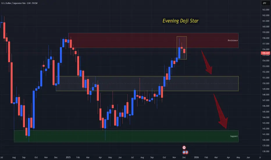 This Candlestick Pattern itself is a strong indication that price is looking to reverse from this Resistance Level at 158 - 156 formed at the end of last year/beginning of this year, but what will also add "fuel to the fire" is if the next candle, being the Confirmation Candle of the pattern turns out to be a bearish one!