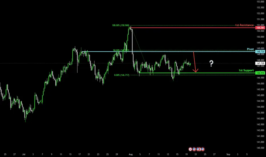 USD/JPY is rising towards the pivot, which acts as a pullback resistance that lines up with the 50% Fibonacci retracement and could reverse to the 1st support.