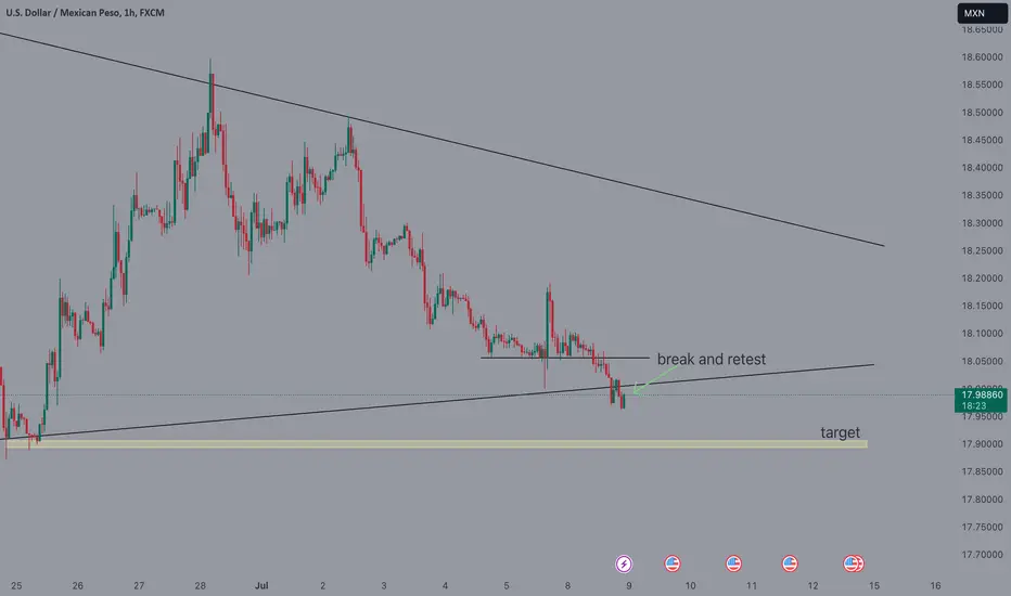 After USDMXN broke the triangle downwards, it tested this resistance and made a lower bottom. It will drop to 17.9 levels soon.