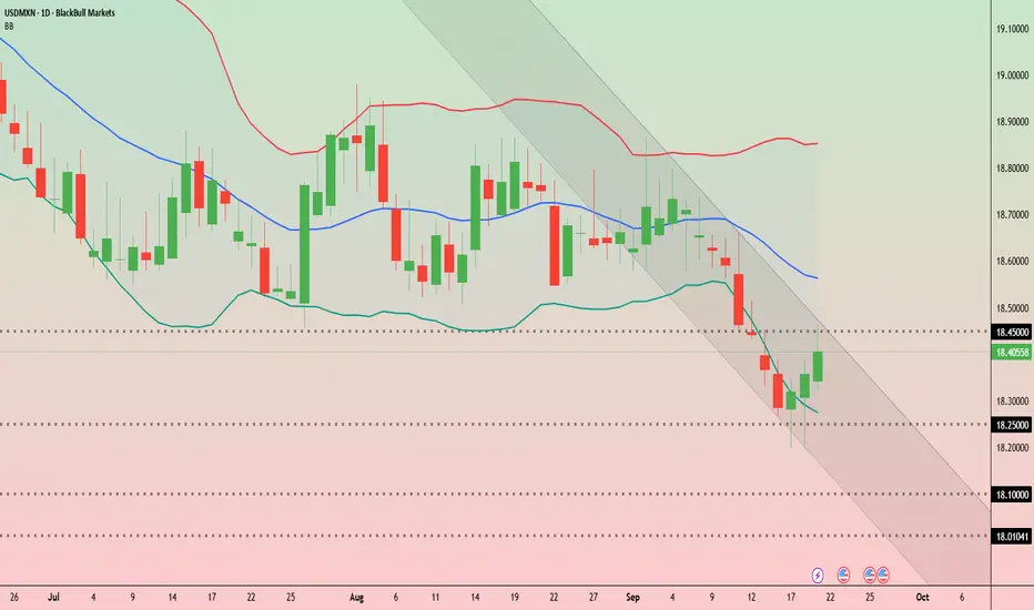 USD/MXN has staged a rebound after sliding to multi-week lows near 18.20. On the daily chart, price bounced off the lower Bollinger Band and is now testing the 18.40–18.45 zone.