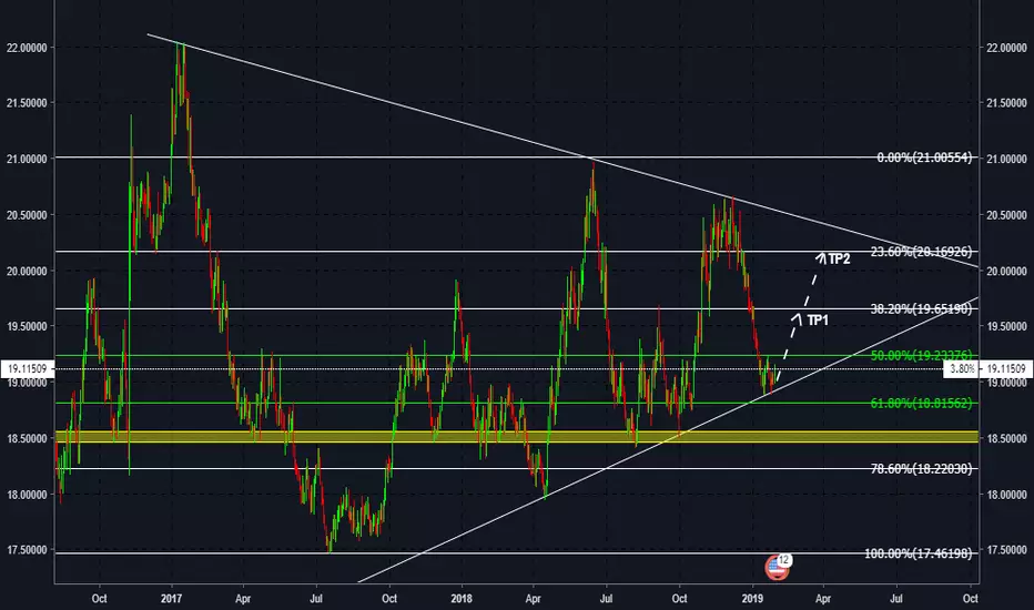 We just caught 1400 plus pips on the sell of this pair (note linked related idea below). I have been waiting patiently for indication of reversal. We just received impulsive bullish movement; note also how price respects trendline and has confluence with 61.8% fib level. TP levels 1 and two are placed at 50% and 61.8% fib extension. Yellow zone is a key demand zone historically. Trade at your own risk and always use proper risk management.