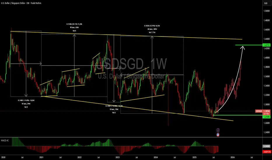 The USDSGD has been correcting since the year 2020. The expanding triangle formation offers a perfect opportunity for investors to trade this asset at the bottom and sell it at the top. Currently the pair is trading close to the bottom giving opportunity to risk taking trades on entry. The target for this pair shall be the top with a stop loss below the trendline.