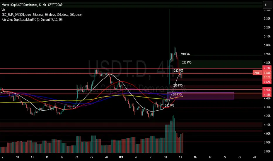The 4H USDT Dominance chart shows a clear rejection from the 4.73% Fair Value Gap (FVG), marking a potential short-term top. Price is struggling to hold above the 4.67% pivot zone, which aligns perfectly with the Daily FVG and the Weekly rejection block.
