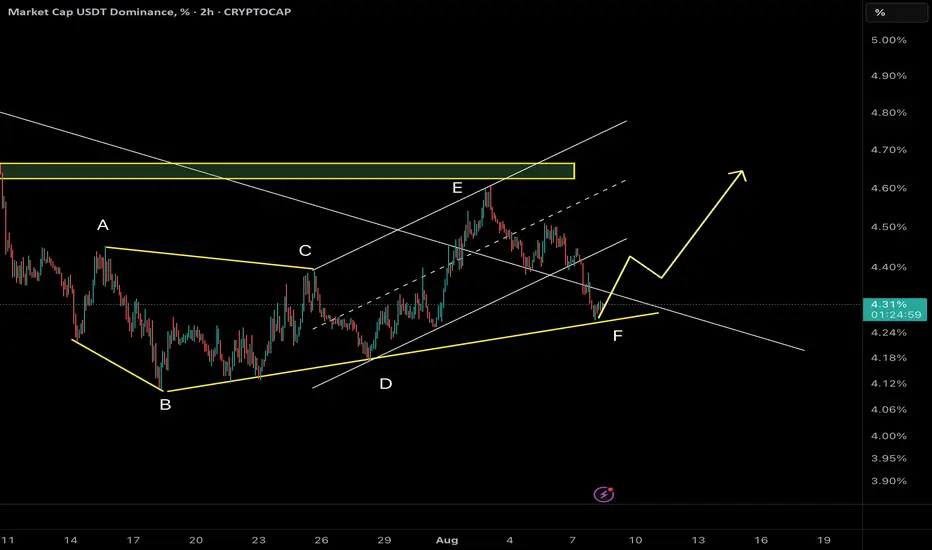 After executing the prior analysis with precision, USDT Dominance has advanced into the final legs of Wave F within the Diametric. Monitoring price behavior near 4.12% will be critical. A bounce here could catalyze Wave G and renewed pressure on altcoins. Should short-term support at 4.22% fail convincingly, deeper retracement becomes even more probable.