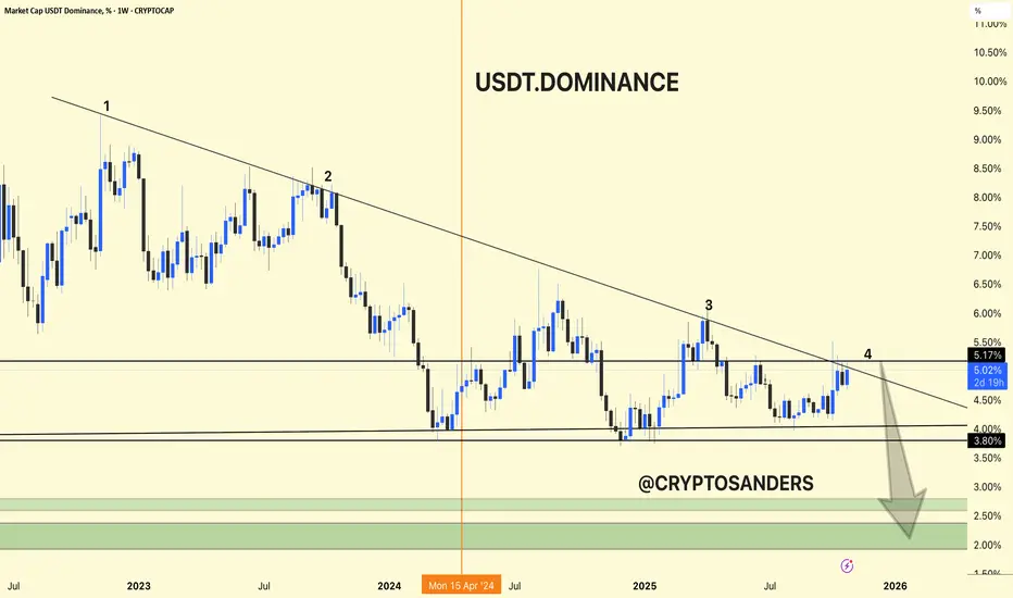 USDT dominance is again rejecting at the long-term trendline resistance (point 4), currently around 5.17%.