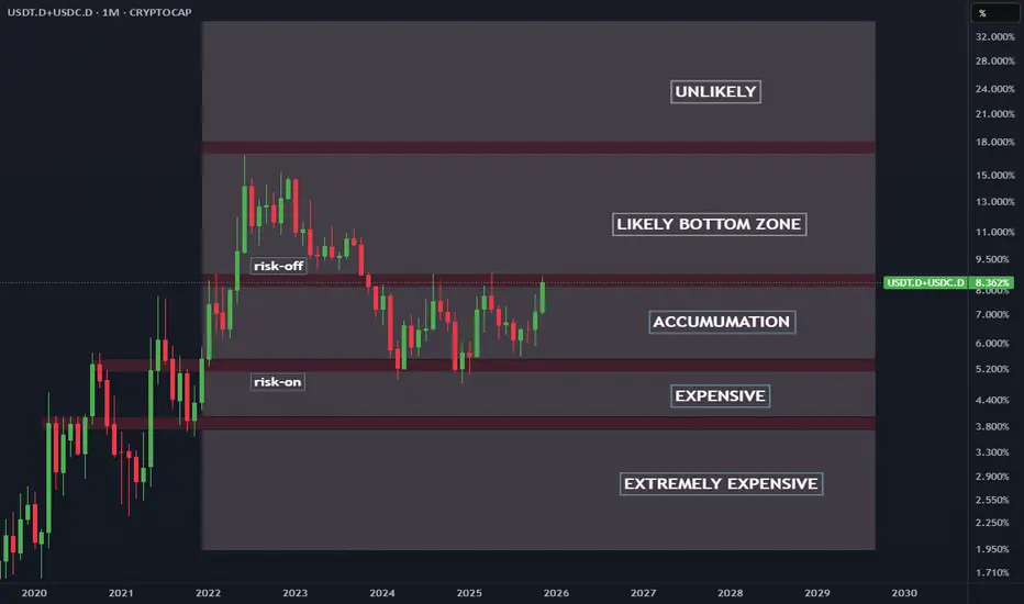 This chart tracks the monthly dominance of major stablecoins USDT (Tether) and USDC (USD Coin) in the crypto market.
