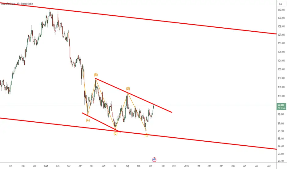 The DXY is currently testing the upper boundary of a well-defined ending diagonal pattern on the daily timeframe — a structure that often appears at the end of a corrective phase, signaling the beginning of a new impulsive move.