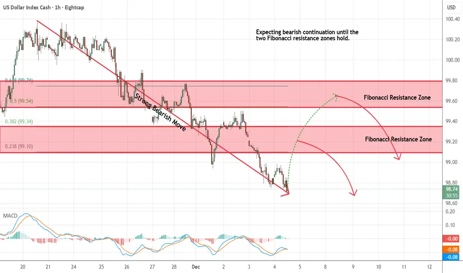 Expecting bearish continuation until the two Fibonacci resistance zones hold.