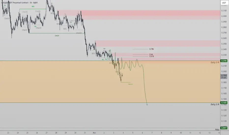 UselessCoin has officially broken down from key structural support, confirming a continuation of the broader corrective phase. The daily support at $0.21 has been breached with multiple consecutive candle closes below, signaling that bearish momentum remains dominant across both daily and weekly timeframes.