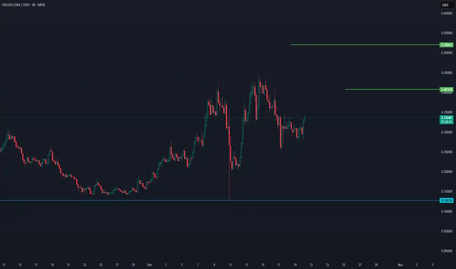 Useless Coin shows early signs of a potential recovery with higher lows forming, but it remains in a consolidation phase. A close above $0.407 on strong volume would confirm a short-term bullish continuation toward the $0.52 level. Failure to hold above $0.30 could reopen the downside toward $0.20 or even $0.128.