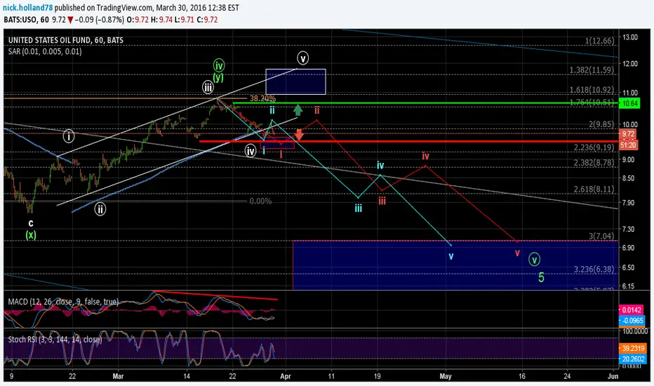 Two notional paths outlined. The new "blue" path is the most aggressive, whereas the red path reflects the expanded flat I'd notated earlier for wave (iv) of I. Below my red box the blue path becomes more probable. Regardless, I'm short from higher. Price staying below 10.64 is key to new lows; signal levels haven't changed.