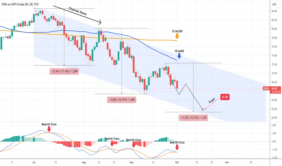 WTI Oil (USOIL) eventually failed to recover the 1D MA50 (blue trend-line), which has been the Resistance since August 13, and reversed the short-term rebound. The 3-month Channel Down appears to have prevailed and technically is now looking for its third Lower Low.