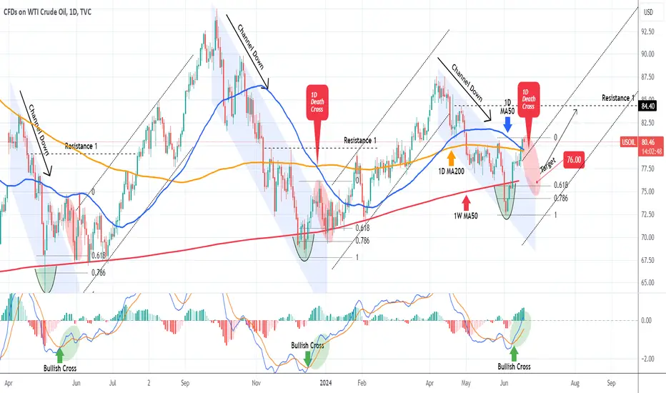 WTI Oil (USOIL) broke above its 1D MA50 (blue trend-line) and invalidated April's Channel Down. Last time we saw such a Channel Down bullish break-out following a rebound on the 1W MA50 (red trend-line) was on December 20 2023 and before that on May 17 2023.