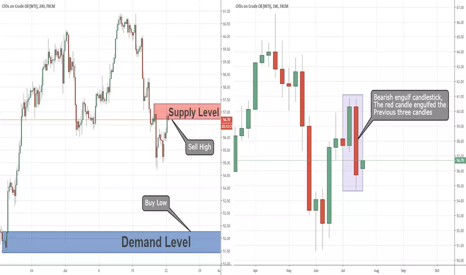 In the W1 chart on USOIL, the last candlestick ended as a bearish engulfing candlestick which engulfed the three previous bullish candles.