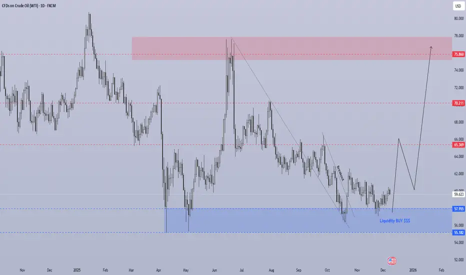 Price reacted strongly from the blue liquidity zone (55.18 – 57.95) — a major demand area where institutions often buy.