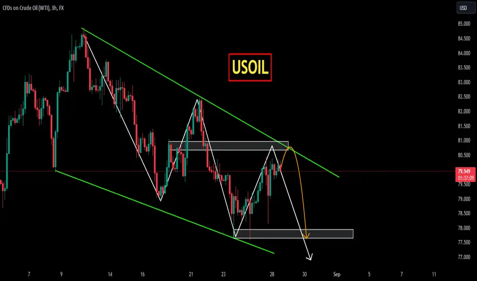 USOIL is trading in descending channel and printing consistent LLs LHs. Currently the price is trading at important resistance zone. As the red candles at resistance zone indicating the sell pressure.