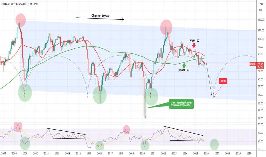WTI Oil (USOIL) has been declining for 3 straight months (current red 1M candle is the 4th one) since the June 2025 rejection on the 1W MA100 (red trend-line). That has been the last rejection of a series of Lower Highs rejections on the 1W MA100 in the past 2 years.