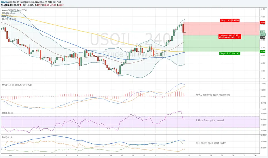 After strong up movement we can see a reversal candlestick pattern. Price bounces from Bollinger Bands with RSI confirmation. MACD histogram falls and gives us one more reason to think about opening short trades. Entry level is below the low of the bearish candle. Stop orders must be placed above the local swing high. Take profit orders should be placed near MA100.