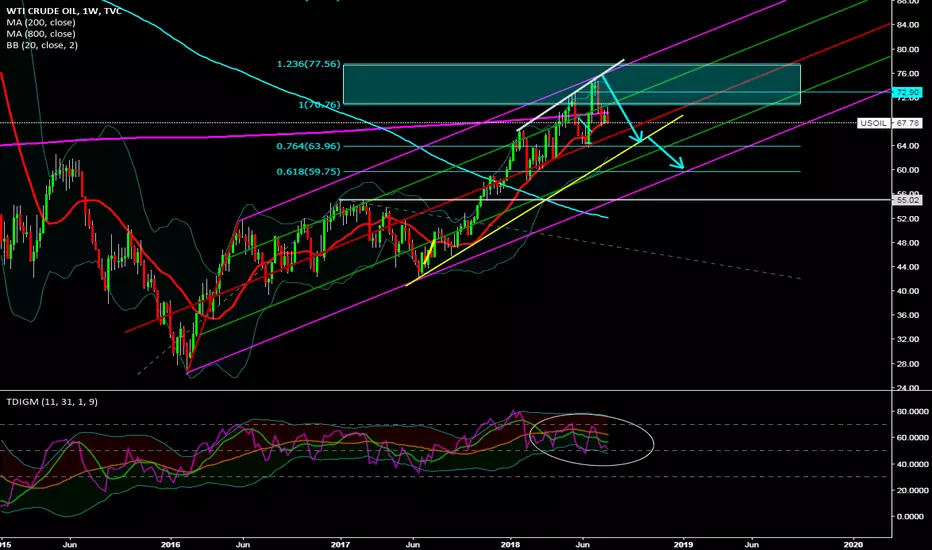 Off pitchfork in an ending diagonal, 800MA on weekly. Equal length to the first 3 wave move... Just did a flat correction and broke out bottom, Oil news coming. Safest to time entries on the pullbacks. It is technically possible for it to come down A LOT. Check your fundamentals.
