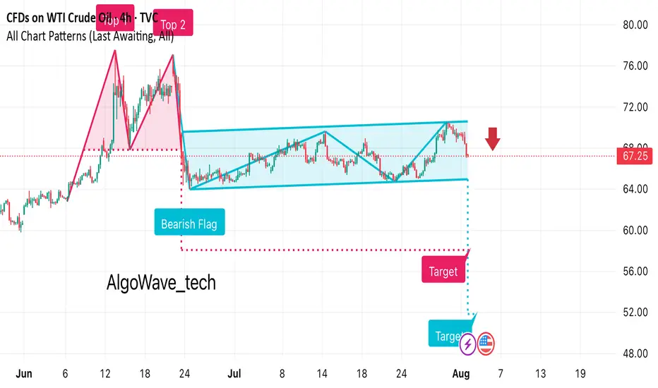 • Breakout: The chart suggests a bearish breakout below the channel, marked with a red arrow at around $67.25.