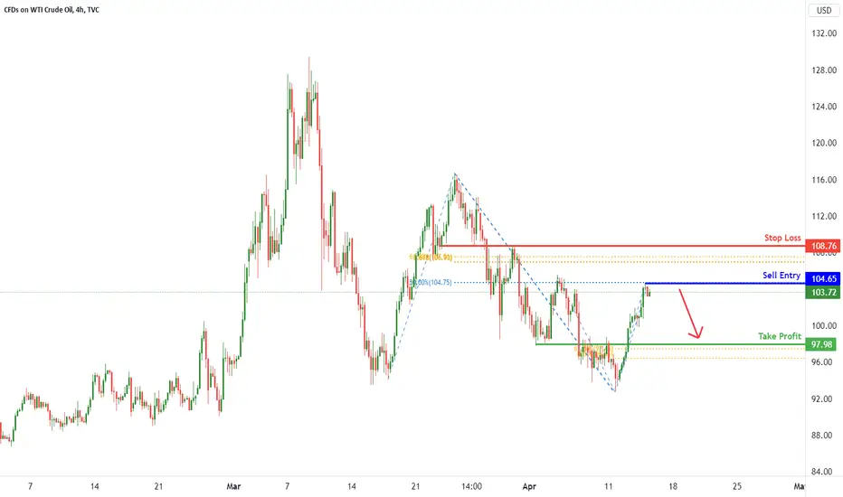 Price is on a bearish momentum. We expect a potential for bearish dip from sell entry level of 104.65 in line with 50% Fibonacci retracement towards the take profit level of 97.98 in line with 61.8% Fibonacci retracement and 61.8% Fibonacci projection. Alternatively, if price breaks through the pivot structure, it might rise towards to the stop loss level of 108.76 in line with 61.8% Fibonacci retracement and 61.8% Fibonacci projection.
