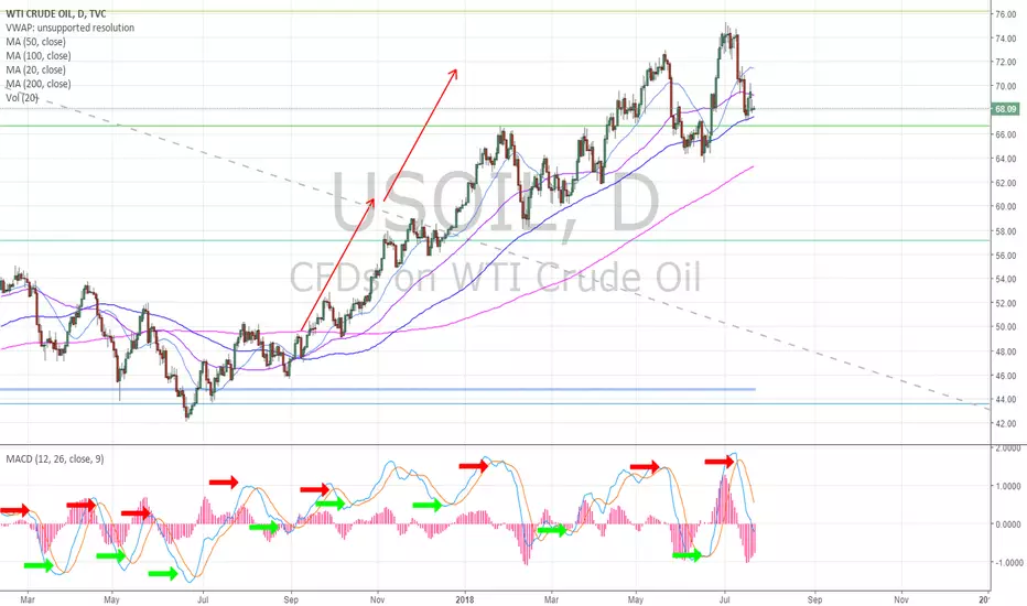 MACD still trending down on daily oil chart with price above 100 MA under 20 and 50. #OIL USOIL WTI