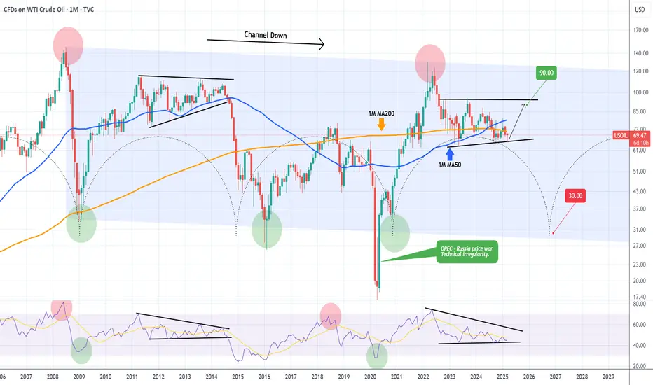 Oil is no different and on this 1M time-frame analysis we see why. The dominant multi-year pattern is a Channel Down and it has started on the July 2008 All Time High (ATH). Right now it appears that we are inside a Wedge pattern similar to 2011 - 2014 and more specifically on the final Bullish Leg towards the top.