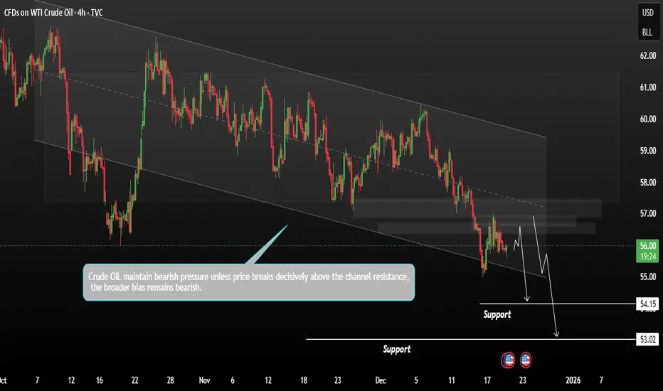 Technically Price has consistently respected the upper and lower boundaries of the channel, confirming sustained downside pressure. Recently, WTI broke lower from the mid-channel region and is now trading near 55.80,.