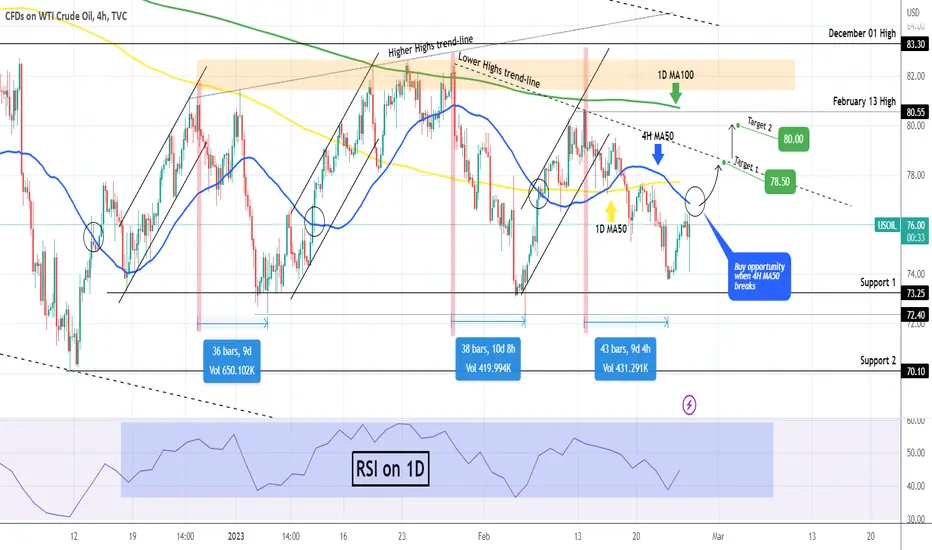 Right now the price is on a strong rebound, slightly higher than Support 1 (73.25) but with the 1D RSI on a confirmed reversal within its range. If you missed the bottom buy opportunity, wait for a 4H candle closing above the 4H MA50 (blue trend-line) as this was a confirmed buy opportunity on all previous three occasions (circles). First target at 78.50 and if the price closes above the Lower Highs (dashed) trend-line, we will re-buy targeting 80.00.