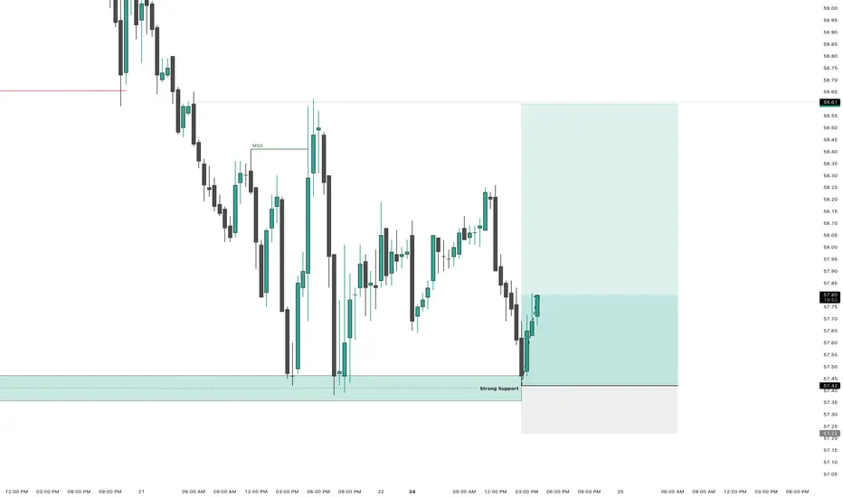 Price tapped a major demand zone / strong support around 57.40 – 57.50, a level previously respected multiple times.