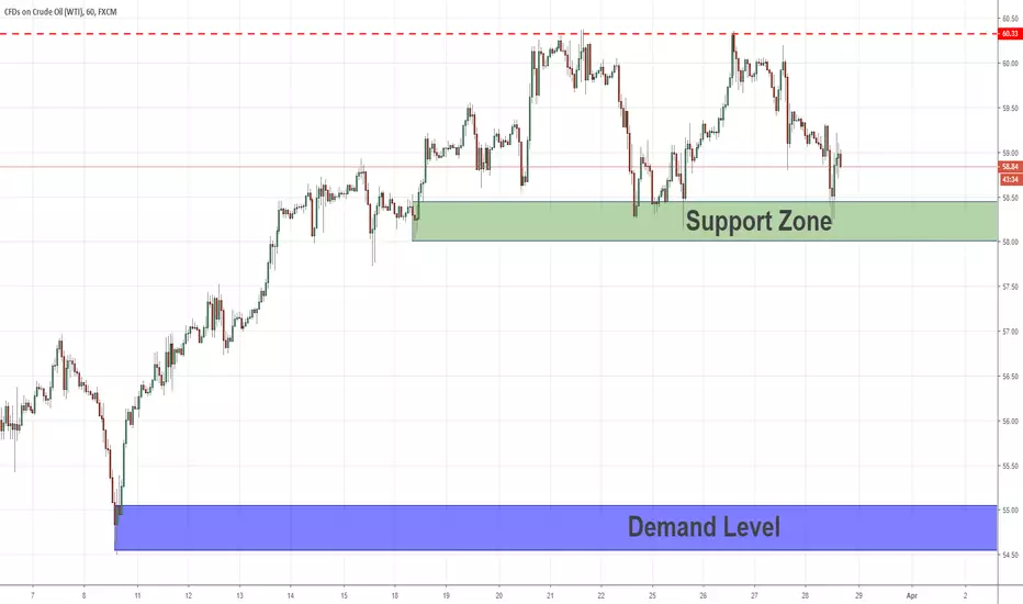 It seems like a potential for a double top pattern on USOIL, the pattern will be completed only if the price will breakout the support below, if that happened I'll look for a price action setup for sell position, also, if the price will break the support below, it indicates the price tends to reach the demand at the bottom, this demand will be my target for the sell position and also a level of buy position,