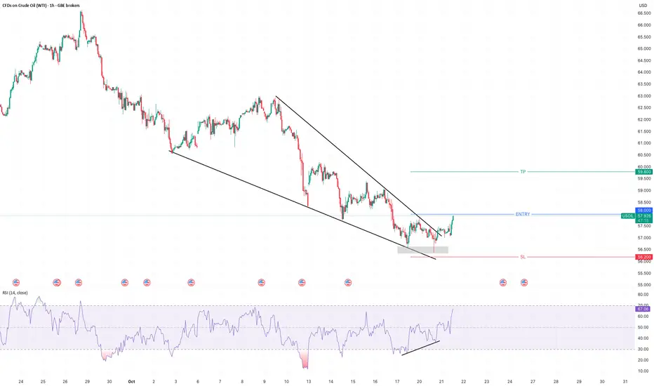 USOIL has formed falling wedge and double bottom and currently testing the neckline. Entry above last lower high.