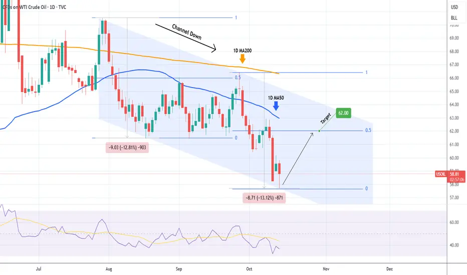 WTI Oil (USOIL) has been trading within a Channel Down since the July 30 High and today it hit its bottom (Lower Lows trend-line). The decline from the recent Lower High was around -13%, similar to the previous Bearish Leg.