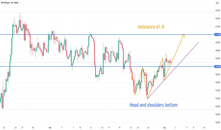 On the 4-hour chart, USOIL stabilized and then moved upwards, forming a head and shoulders bottom pattern in the short term. Currently, watch for support around 59.0; a pullback and stabilization after this level could present a buying opportunity. Resistance is seen around 61.0.