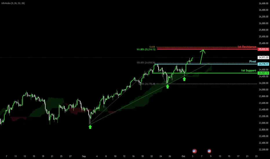 USTEC has bounced off the pivot which is a pullback support and could potentially rise to the 1st resistance.