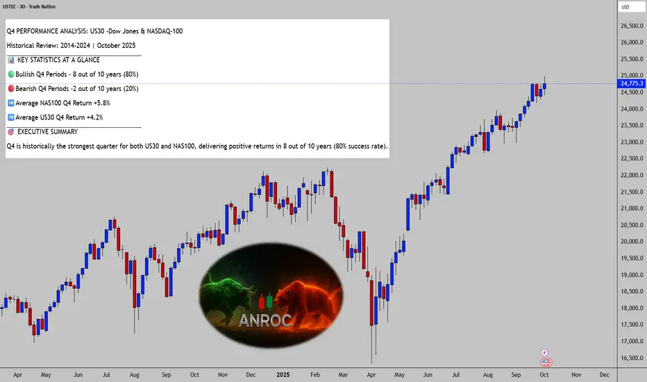 Q4 is historically the strongest quarter for both US30 and NAS100, delivering positive returns in 8 out of 10 years (80% success rate).
