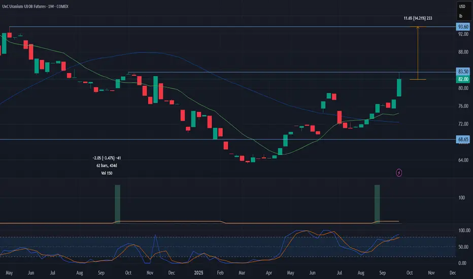 Over the past month, uranium futures have posted strong gains, reaching the October 2024 high of $83,5. A pullback from this level is possible; however, in the longer term, uranium remains in a bullish trend. The next upside target is $93,6.