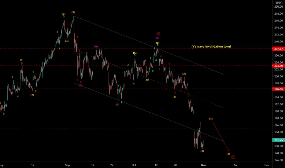V - It is in ABC zigzag from major high. The drop is the part of C wave down and 4th wave will start correcting now. Sell when 4th wave completes near 185-88 zone for one more low of 5th wave.