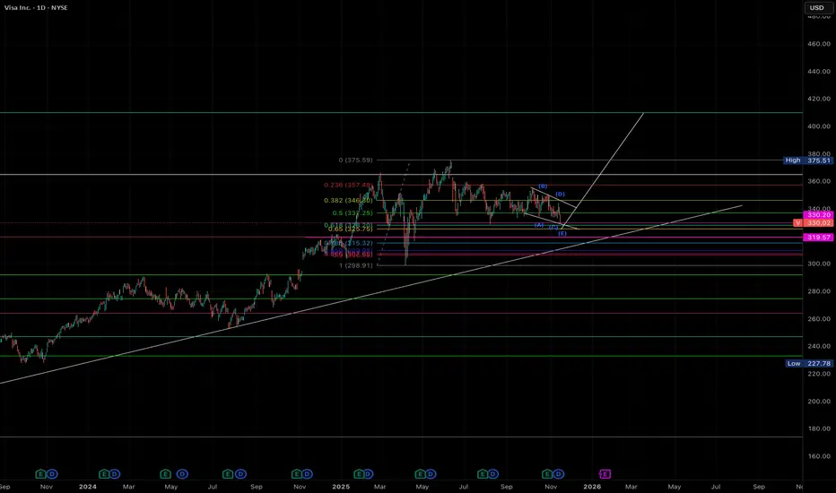 Visa is completing a corrective compression cycle into a multi-year trendline with Fib confluence and institutional support levels. This setup tilts the probability toward a bullish breakout and trend continuation. If visa holds this support area and breaks the descending wedge there is a possibility of reaching $375 and $400. Alternative breaking this support area may open the door to $320.