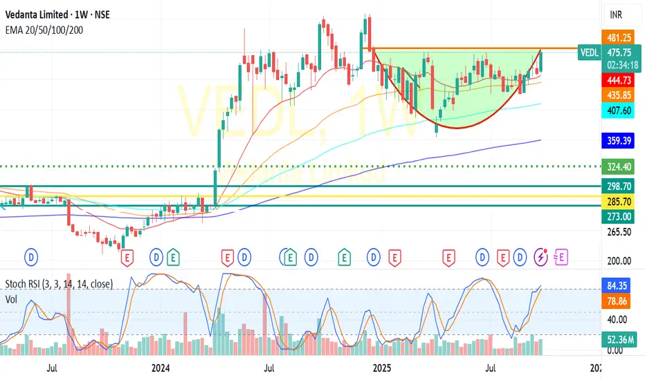 VEDL:Showing great momentum and trading above all its 20/50/100/200 DEMA averages in long term chart.Also formed a rounding bottom in weekly chart,price and volume action suggests neckline breakout at 480 likely to test 500+(For educational purpose only)