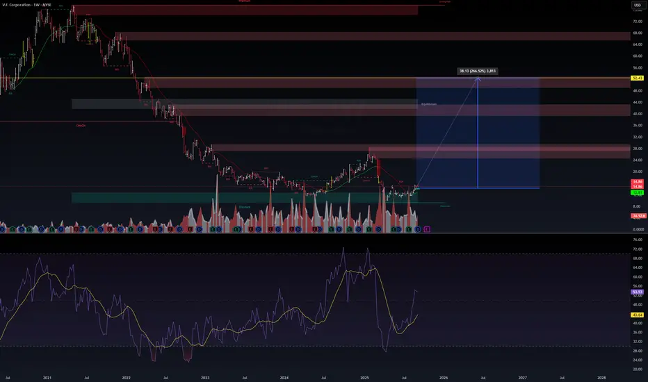 VFC is in a high-risk, high-reward accumulation phase. A successful turnaround could unlock significant upside, with long-term targets near $52. However, failure to sustain consumer and brand momentum could keep price range-bound near $12–$15.