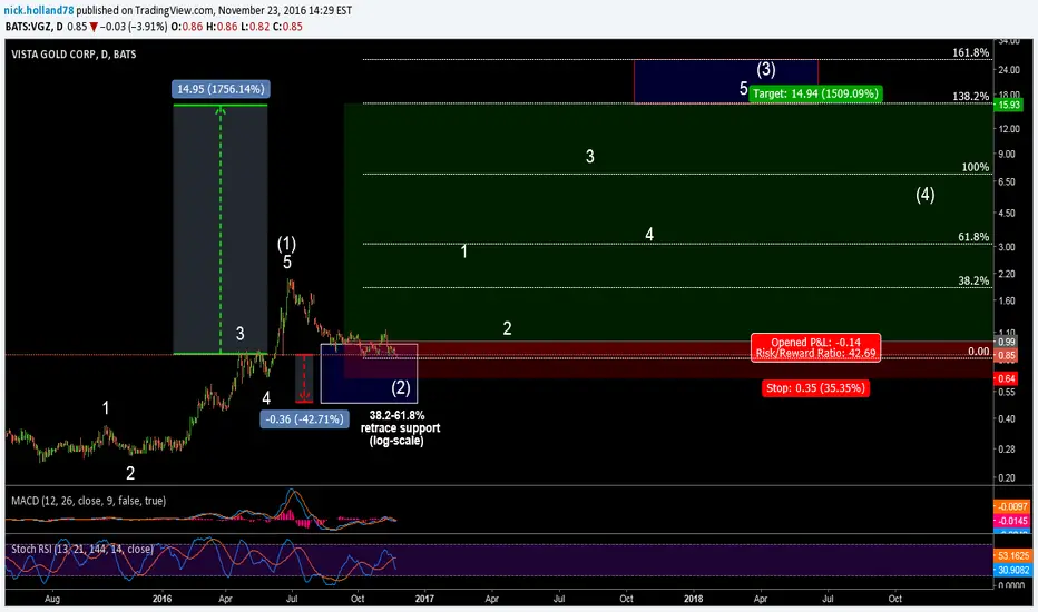 Note: positive divergence holding nicely on MACD, but wave (2) box goes some -43% deeper...