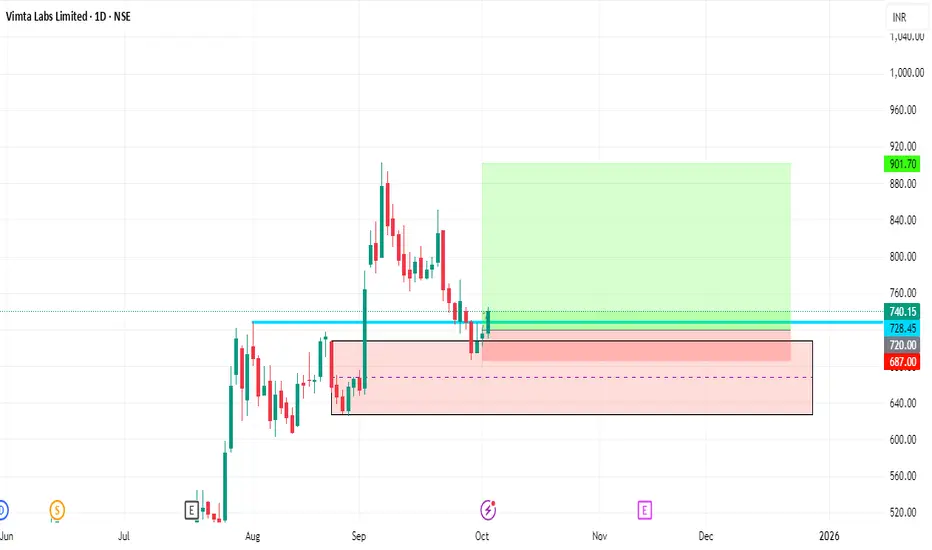 Sharing a fresh daily chart setup for Vimta Labs Limited (NSE:VIMTALABS). The price has just bounced from a strong support zone in the ₹687–₹720 range, showing renewed strength after a corrective move. Volume has increased at this level, suggesting buyers are stepping back in.