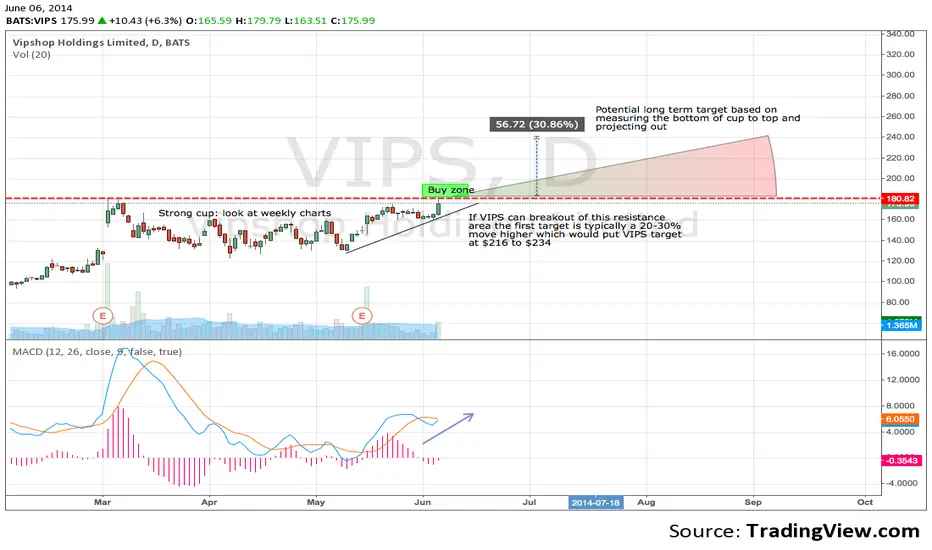 2 Weeks ago I posted on VIPS, the stock is ready to break out of its cup, watch it and look for buying pressure and volume, it is Chinese stock so caution on it as can be more issue on the numbers