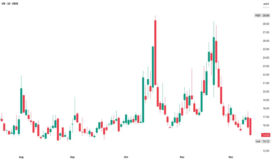 A VIX ~15 during a macro-calm period normally means the market believes no near-term recession risk, earnings risk contained & the Fed's path relatively stable, but it also means any surprise (Fed tone shift, earnings miss, geopolitical flare) can cause outsized reactions, because positioning is light on hedges