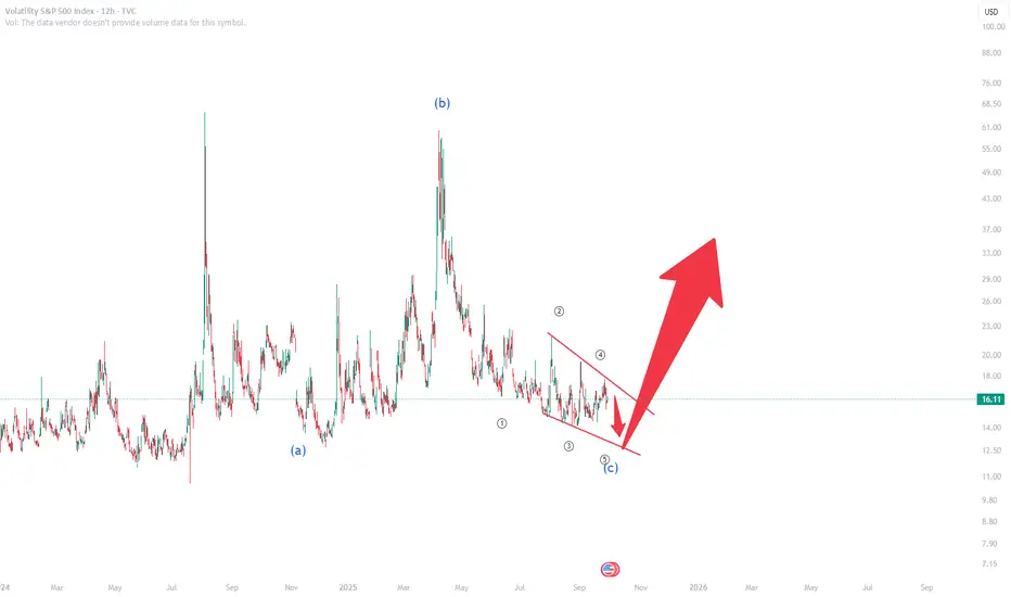 The VIX index is finalizing an A-B-C corrective structure, with the C-leg forming as a diagonal. Price action suggests this structure is close to completion. Once the diagonal ends, the probability of a sharp upside move in volatility becomes highly likely.